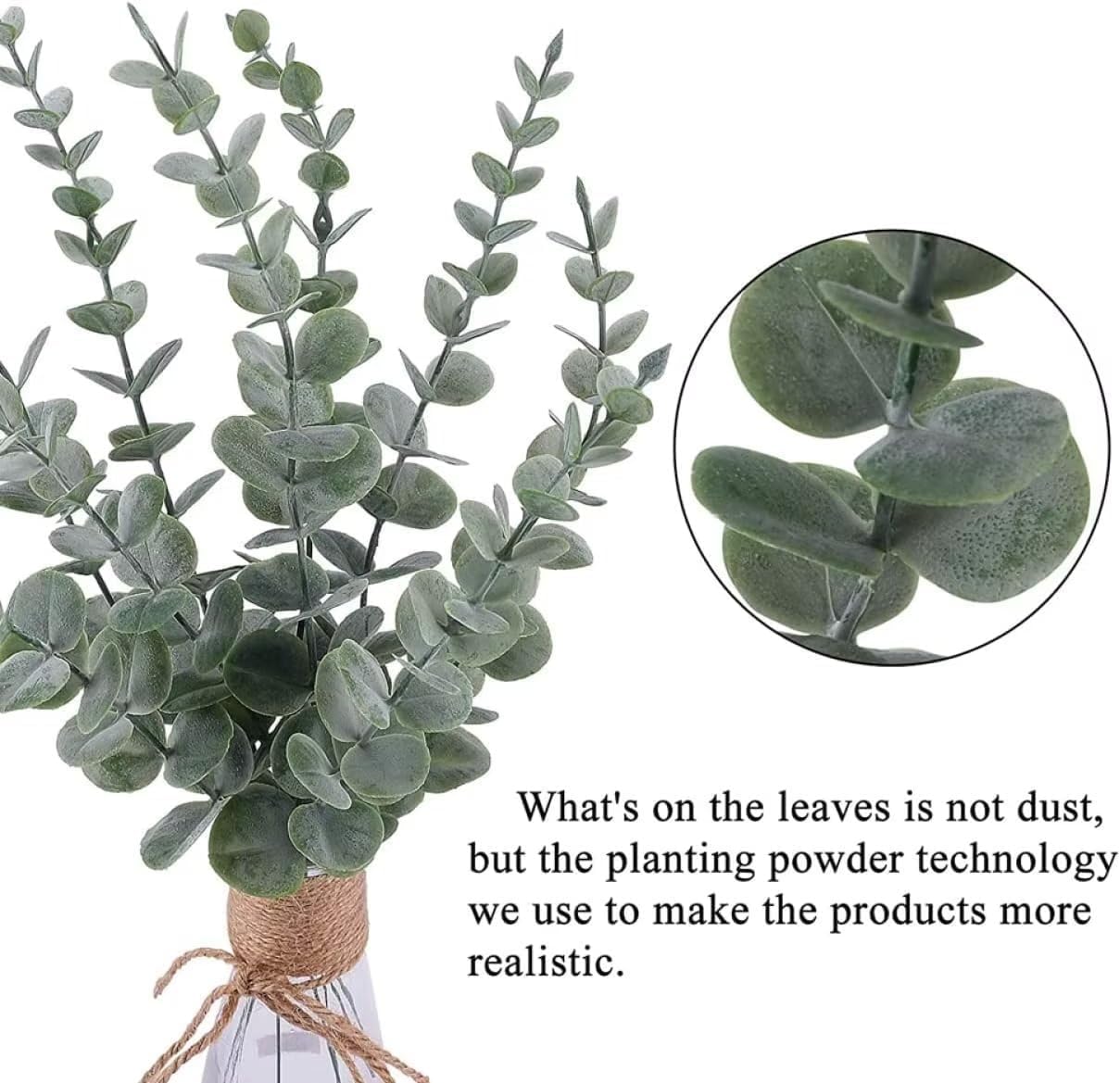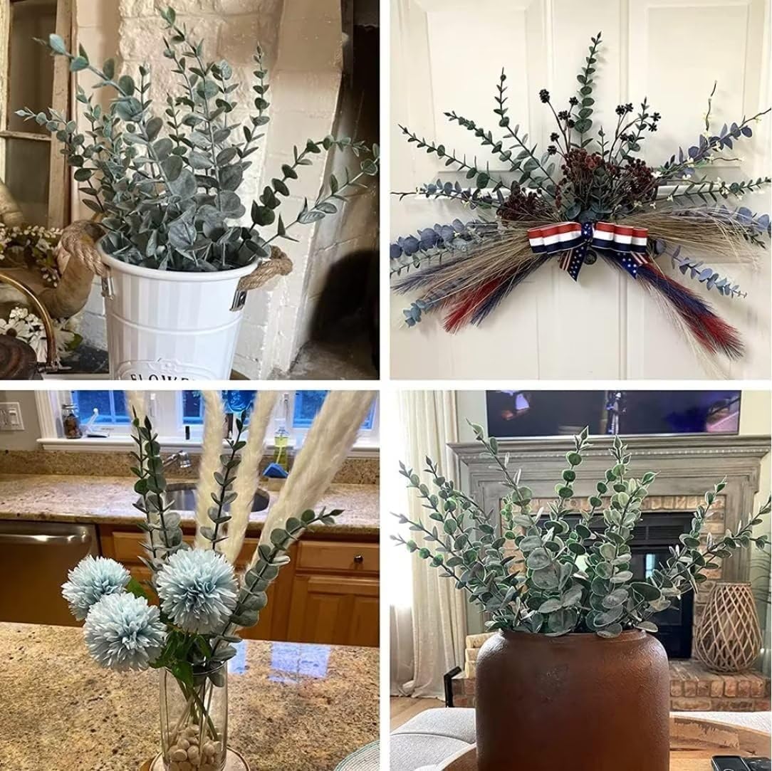 - 【Beautiful Artificial Plant】The eucalyptus is a popular option for both indoor and outdoor. Its gray-green leaves surface has light white powder, just like condensed hoarfrost. The eucalyptus stems sold by sukh are artificial, and the surface of its plastic leaves is sprayed with gray-green and white paint, which not only restores the appearance of natural eucalyptus leaves, but also makes it look very comfortable with this color combination.