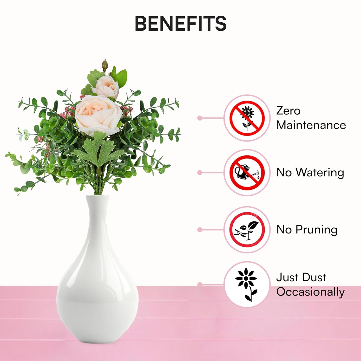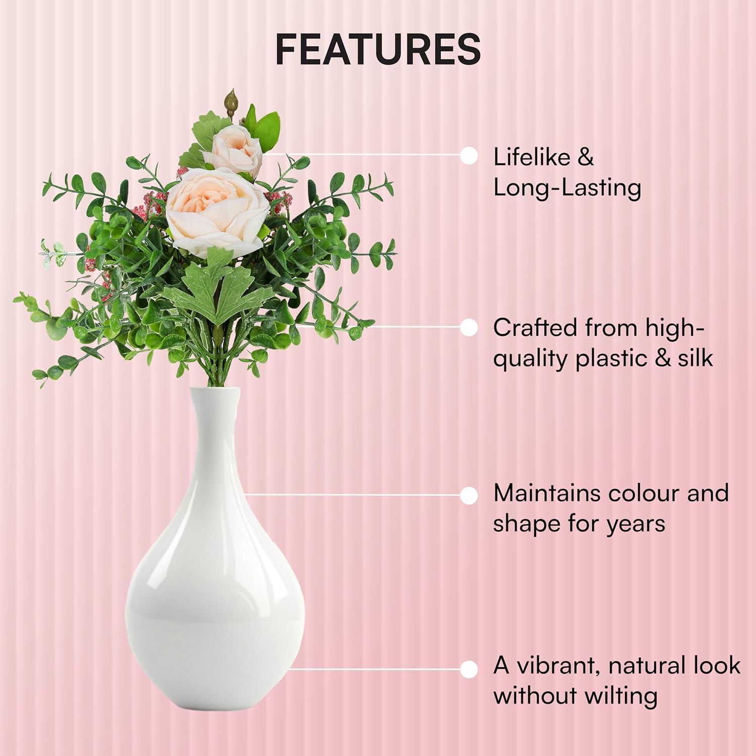 Artificial Rose Bouquet with Greenery, 30 cm | Flower Arrangement, Fake Plastic Flowers for Home, Wedding, Garden Party Decoration,Artificial Rose (Peach Colour)