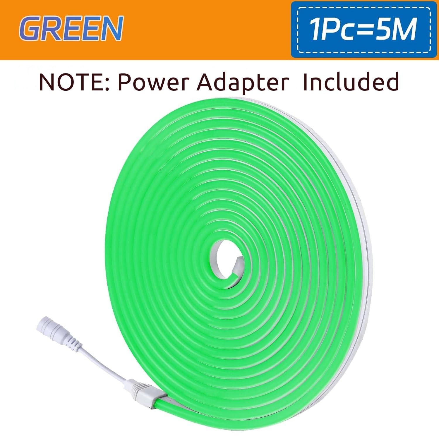 Green Neon LED Strip Light 5M | Flexible Silicone Rope Light with 12V Adapter | Waterproof IP65 Plug-in Tube Light for Room, Outdoor, Balcony, Garden, Party & Festival Decoration