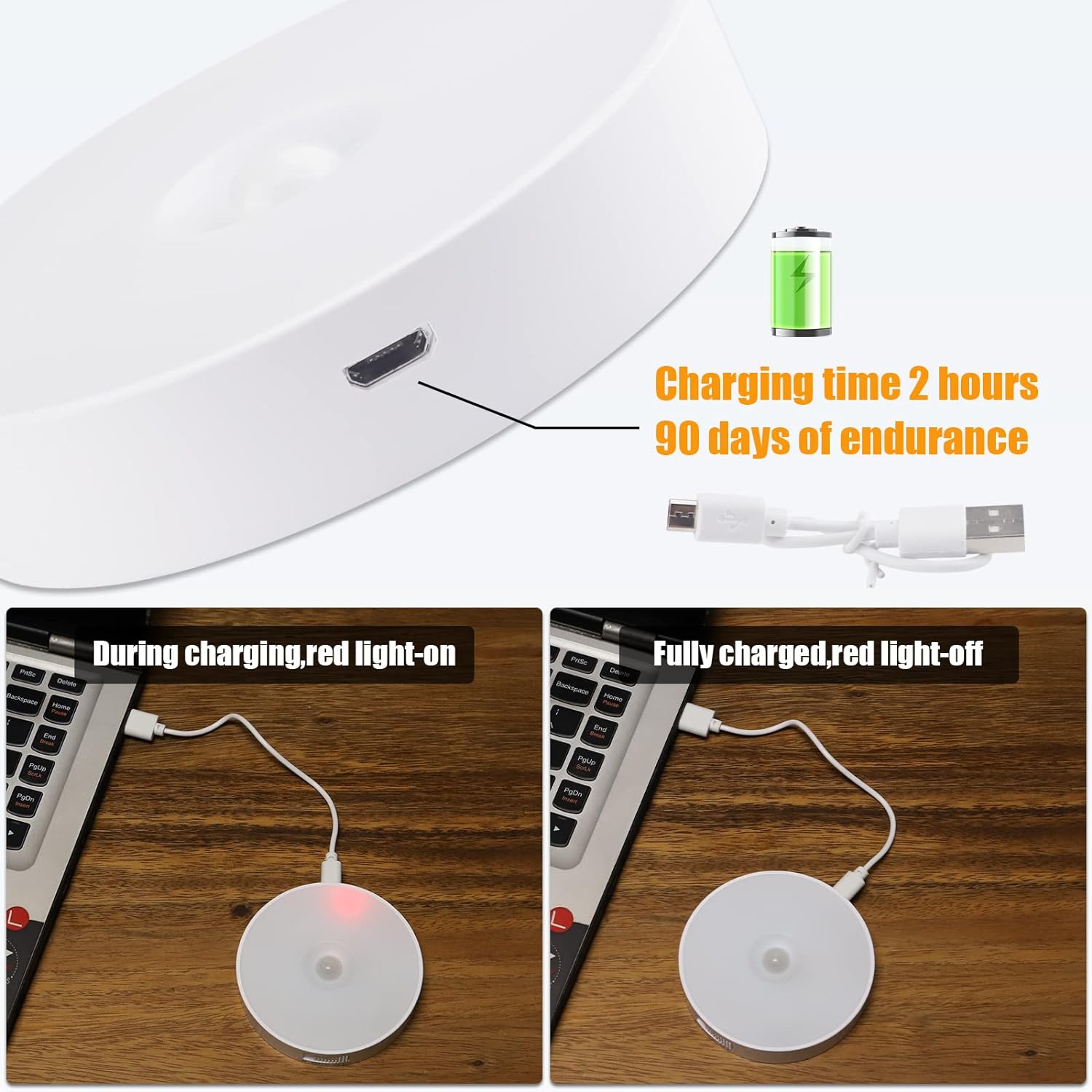【USB charging】Cabinet Lights contains a rechargeable lithium battery, no longer worry about buying batteries, the LED night light can work continuously for more than 60 days in PIR mode after a full charge (regular home use).