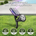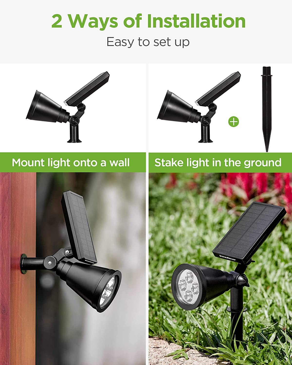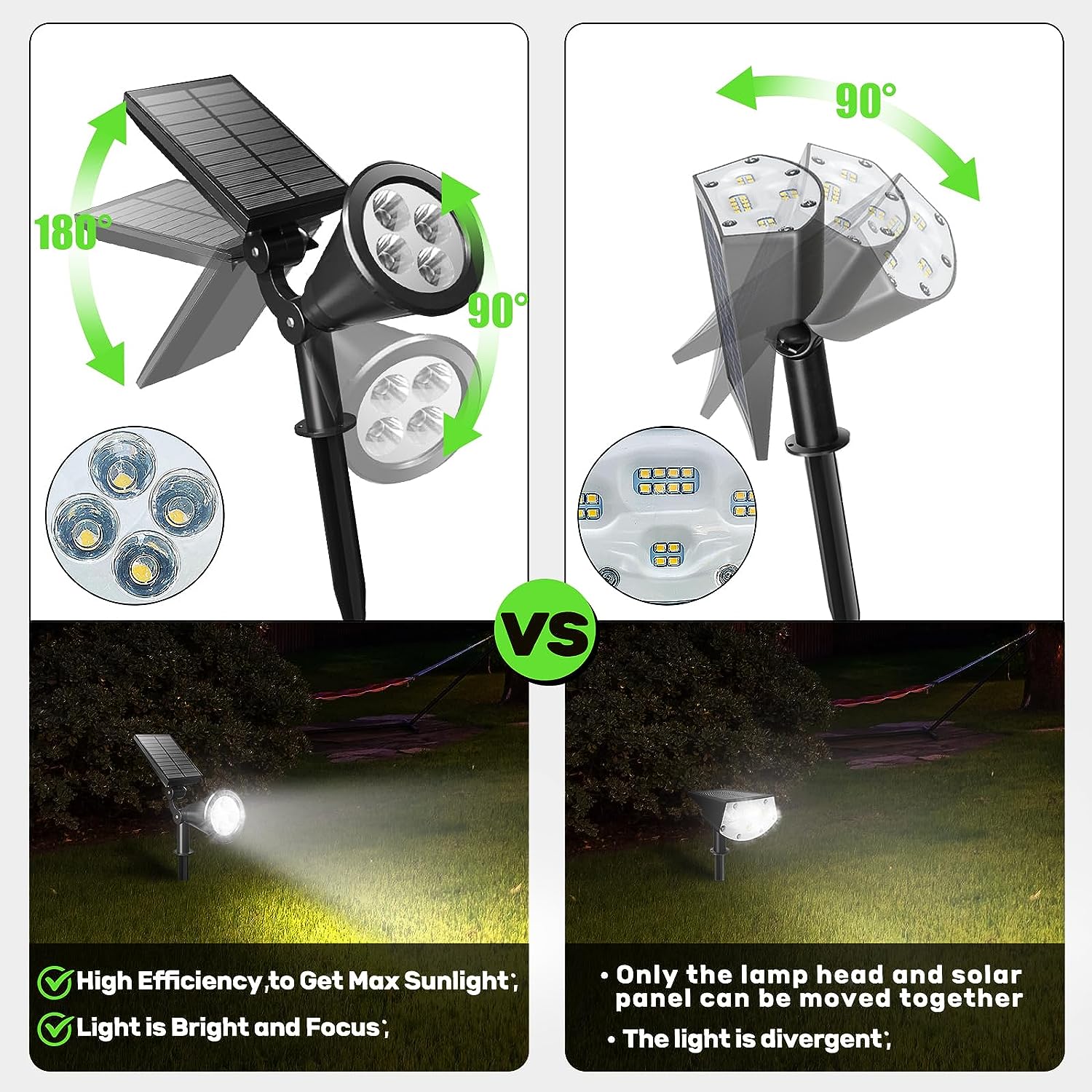 - High Efficiency: The solar spotlights outdoors have independently adjustable lights and panels. The advanced 1.5W Monocrystalline Silicon Solar Panel can be adjusted 180 degrees vertically. This means that the solar spotlight can be adjusted to the right angle, getting an effective sun, which can be charged quickly and efficiently. At the same time, the lamp head can be rotated 90 degrees, which can obtain the best lighting angle and can illuminate unreachable places.